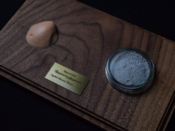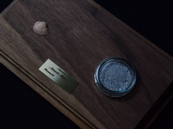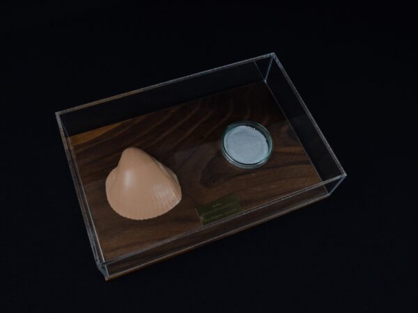 A Life Without Form consists of a series of 36 display cases in various sizes. Each case contains, on one side, a casting from the inside of a shell, representing the living force that once fueled its embodiment. Opposite this, the corresponding seashell is presented, ground down into powder.