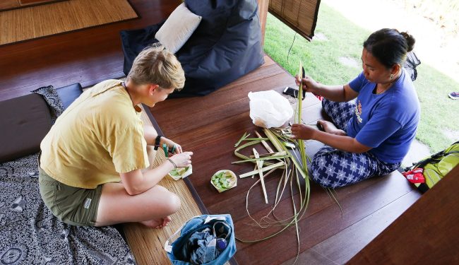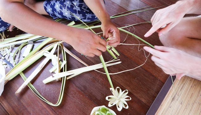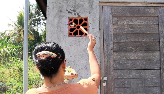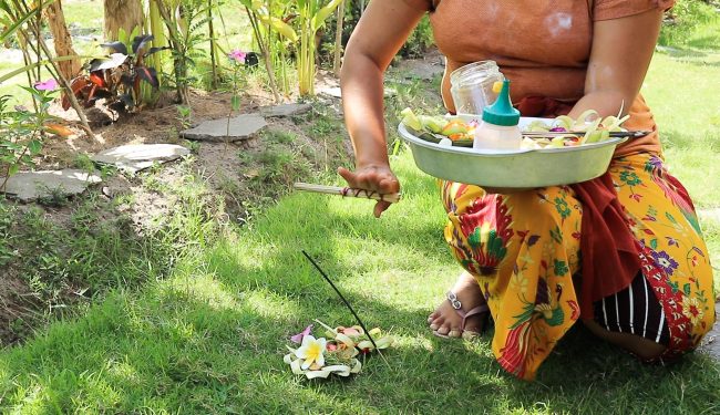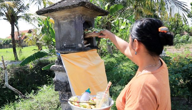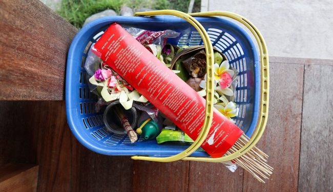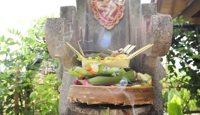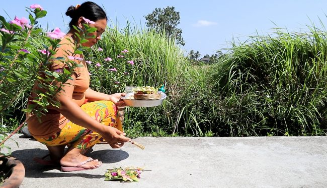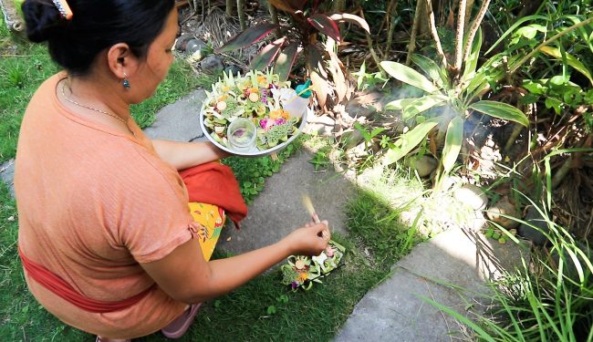 During my time in Bali [Indonesia] I encountered many daily offerings locally known as “Canang Sari”. This practice of giving thanks stems from a local combination of beliefs such as a distinct form of Hindu worship, animism, ancestor worship and reverence for Buddhist. The “Canang Sari” can be made for all kinds of reasons and occasions. Traditionally a little basket generally consisting of banana & coconut leaves is handmade everyday and holds the offering. The often colourful and lively looking offerings may be found at home or in the immediate vicinity to your house. At work or in the main street. At the front door or in the garden. They are placed and prayers spoken in order to please the gods and bring luck & good fortune for people, other living beings, this specific location and its energy.