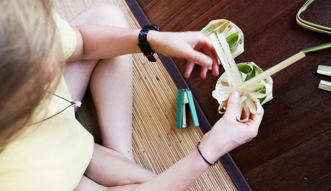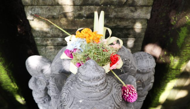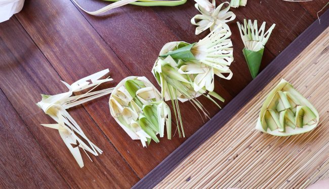 The above offering is meant for the garden and contains several types of flowers. A general rule is that all flowers may be chosen for offerings to gods, goddesses & the sun. However there are also more specific uses for certain ingredients, for instance the red hibiscus is said to represent the shape of the Goddess Kali’s tongue and its colour shows her fierceness. The flower Marigold is Ganesha’s favourite and the colours yellow & white are special to the god Shiwa. The main green component is pandan leaves which have a distinct scent and are offered especially to Vishu. Through the choices in flowers & other ingredients the Canang Sari may appeal to different entities and aspects of life and increase the likelihood of successfully conveying the desired message.
