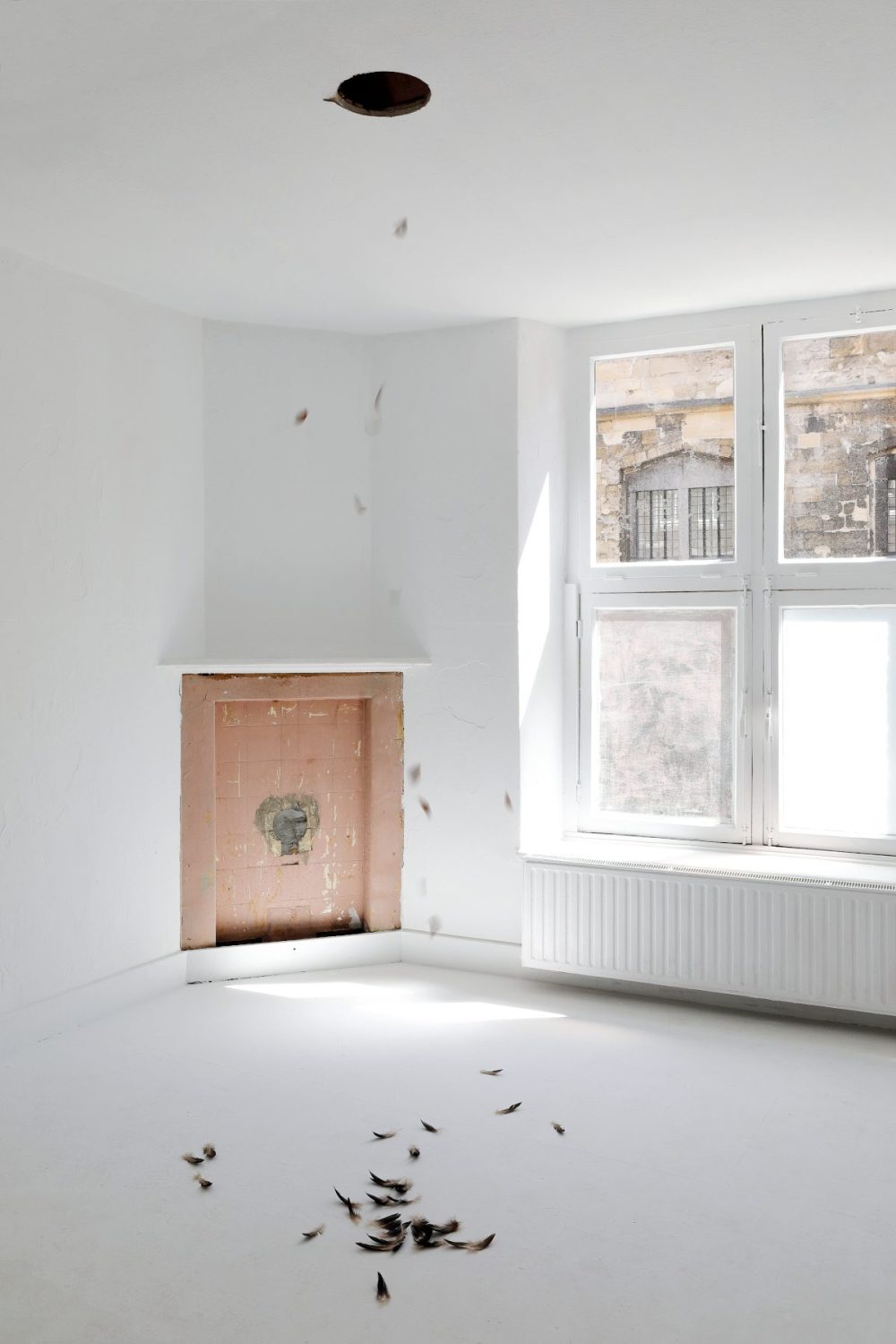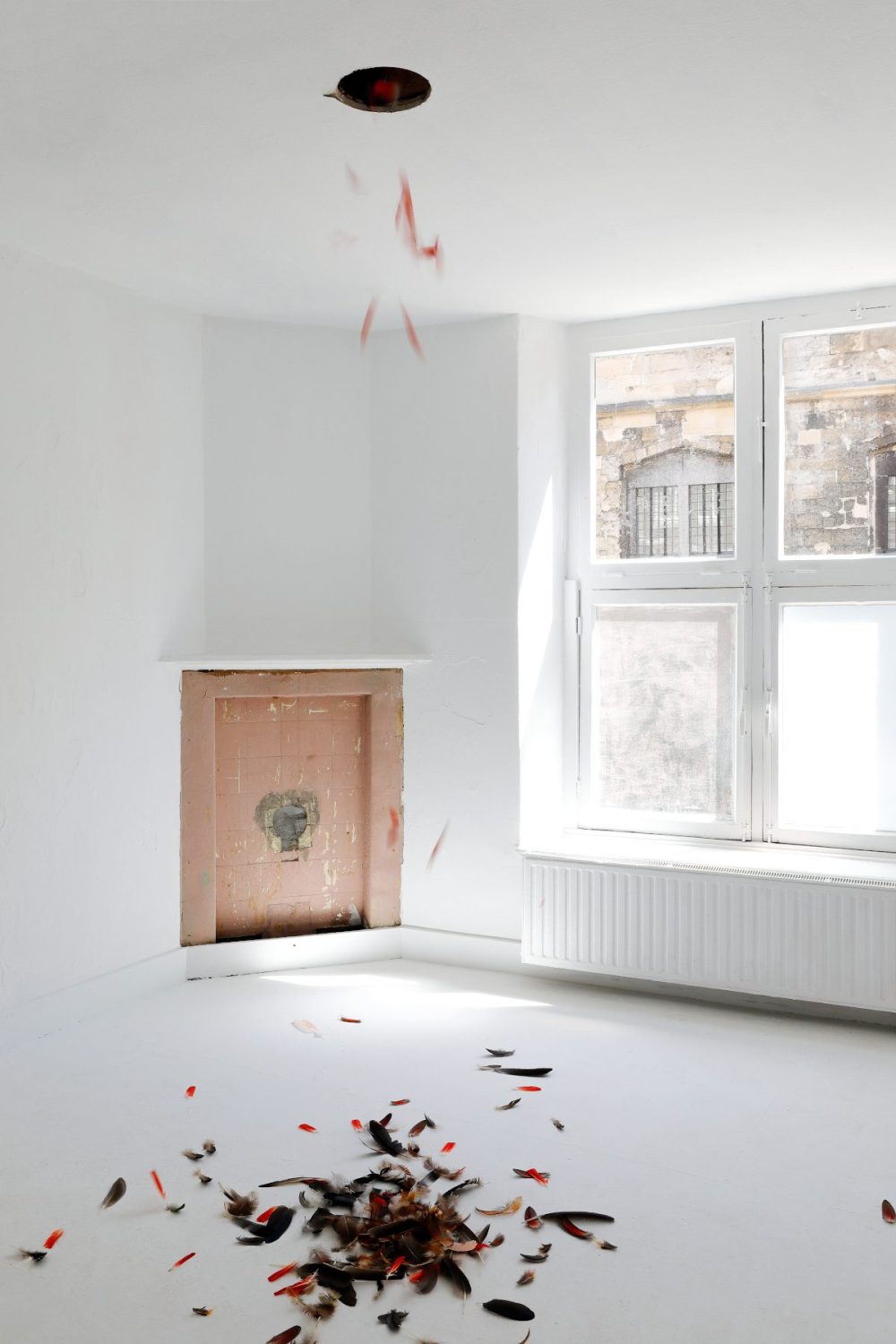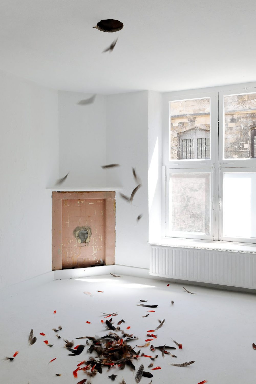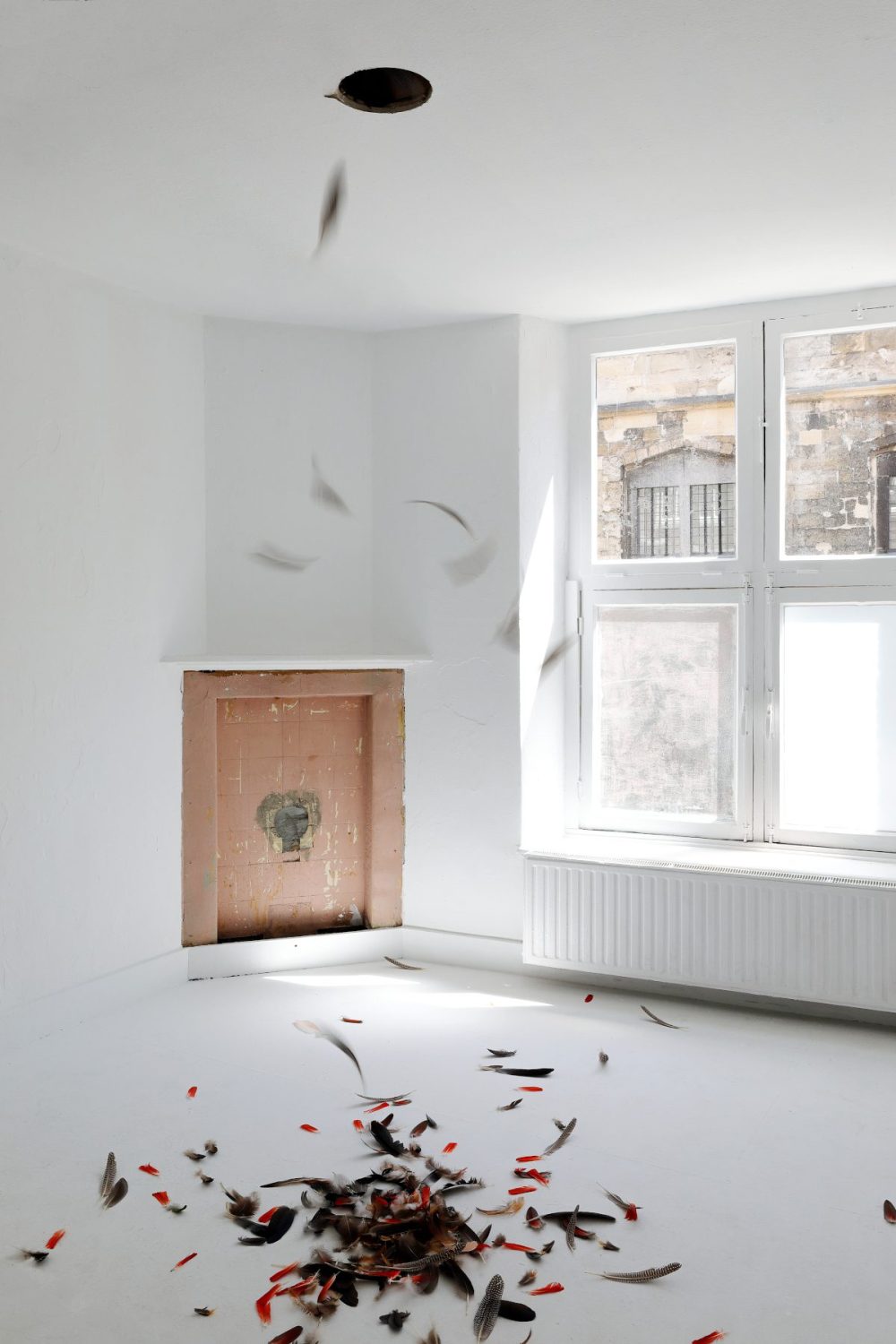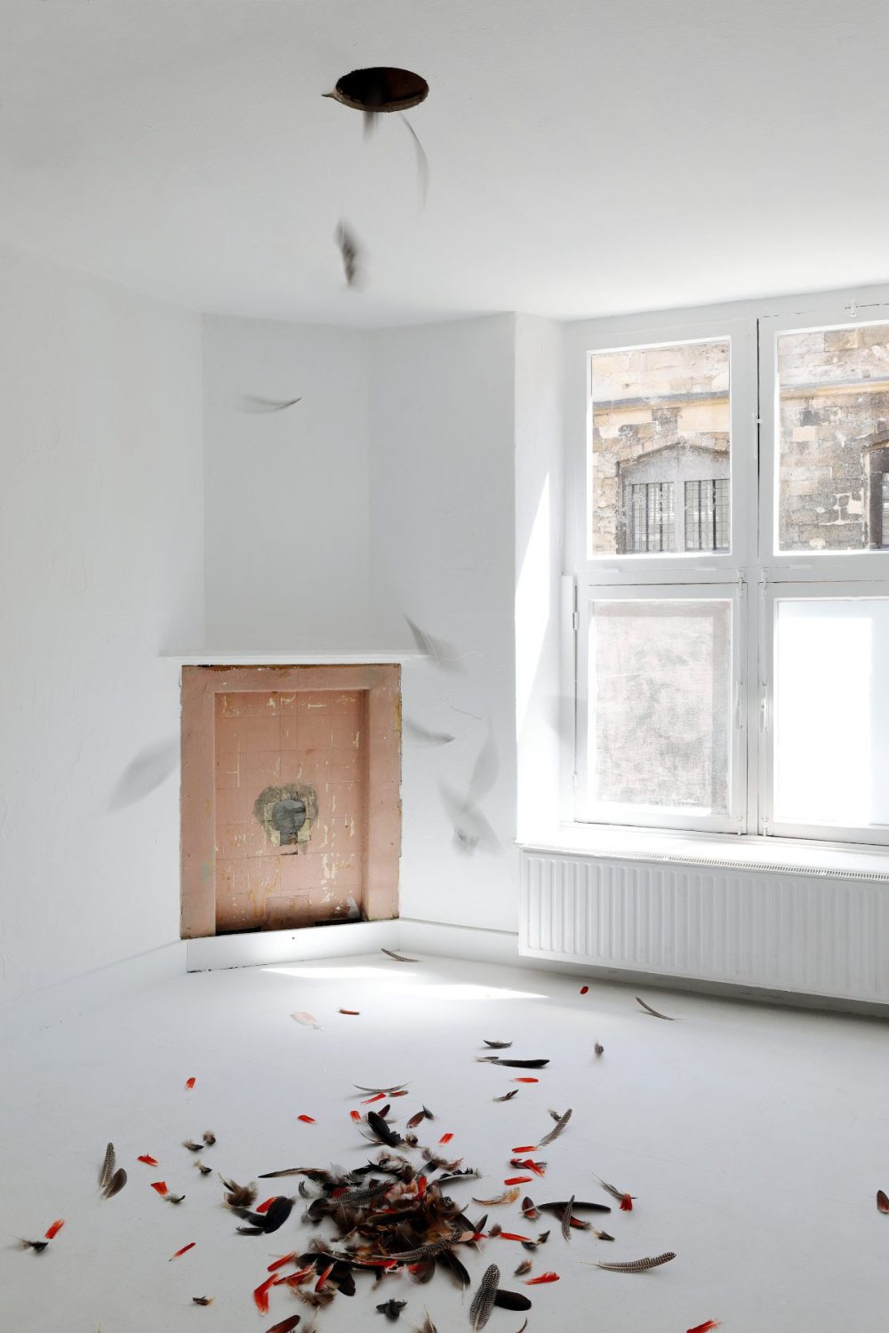 A selection of feathers is intuitively chosen and released to the lower room. Detached from their natural purpose to serve flight, the feathers are now able to show their own unique personality. As they dance down from the ceiling a magnificent and ethereal play reveals itself. The feathers’ descent is guided by what once was its natural function, its remaining form as a separated entity in combination with what seems like the will to express its newfound identity.
