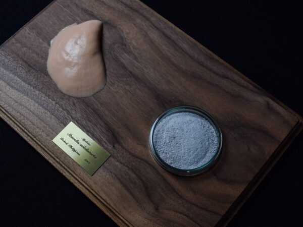 walnut wood, seashell powder, silicone, glass, brass, greencast plexiglas, variable dimensions, 2022