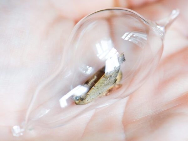 Please not that the insects remains within the glass cocoon can and are intended to decay over time. The cocoon serves as a time capsule, protected from outside influences it slows down the process of transiency and allows one to play closer attention to the wonders of transformation.