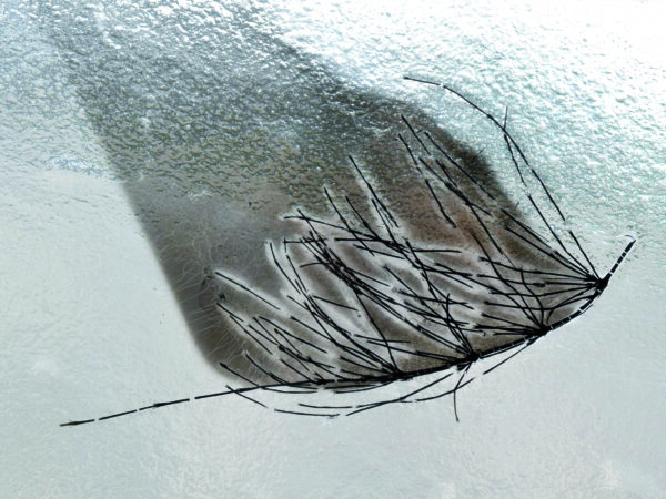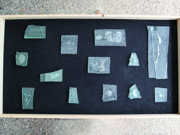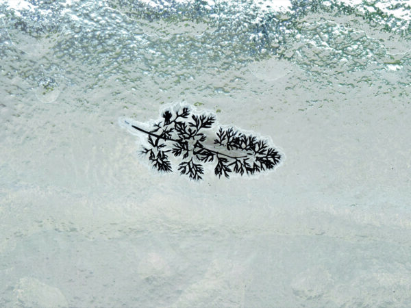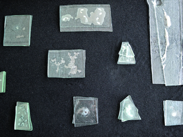 Future Fossils shows recordings of predominantly plants being imprinted within glass panels so that their presence is captured and may be remembered.